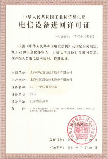 2018年7月,移远通信AG35车规级模组顺利通过电信设备进网检测机构的测试和国家工信部的审查,并取得了由工信部颁发的电信设备进网许可证。这意味着移远车规级模组符合入网要求,已获准接入公用电信网使用。